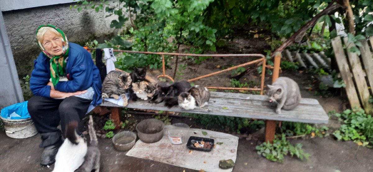 Проїжджаючи околицями Бучі ми зустріли дуже добру бабусю. Вона доглядає за котиками. Їх в неї всього 10. Після знайомства стає зрозуміло, що бабуся ділиться з тваринками останнім що має.