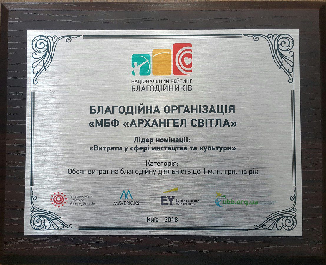 BO»MBF "Archange Svitla" est devenu le lauréat du classement national des philanthropes dans la nomination : "Dépenses dans le domaine de l'art et de la culture", forum ukrainien des philanthropes "Classement national des philanthropes 2018" dans l'espace de flux INVERIA.
