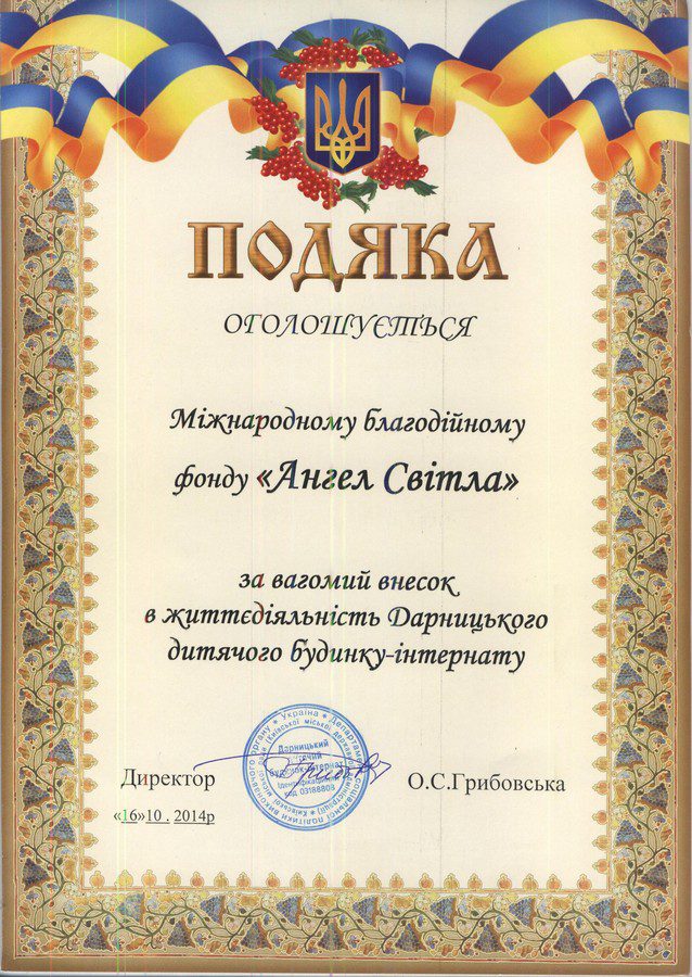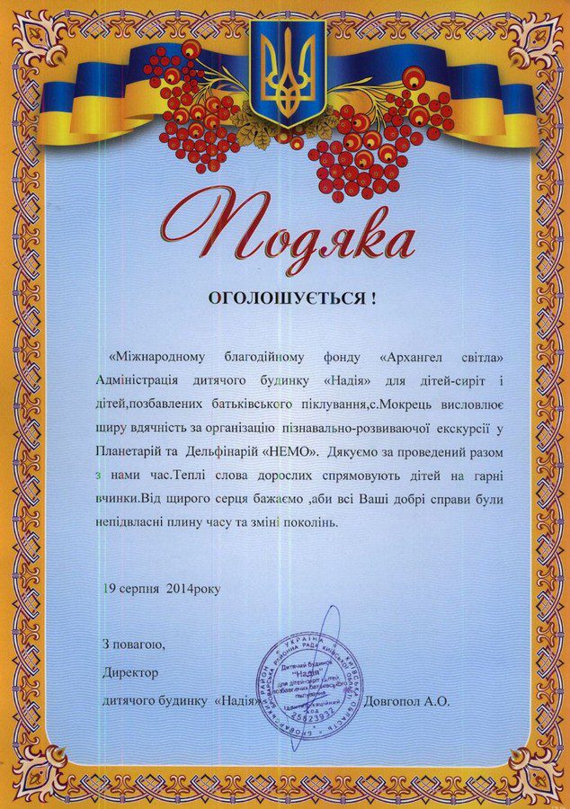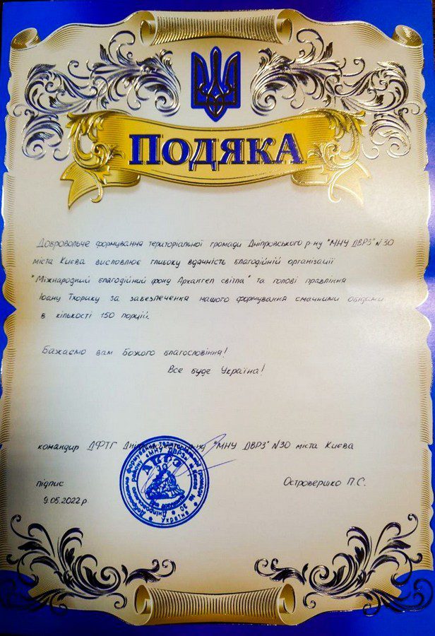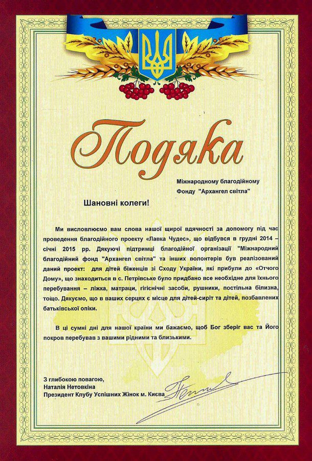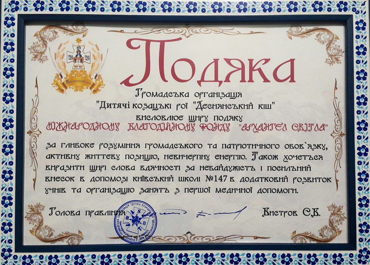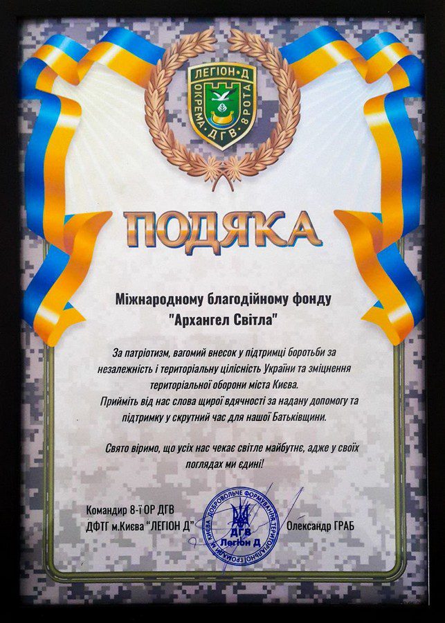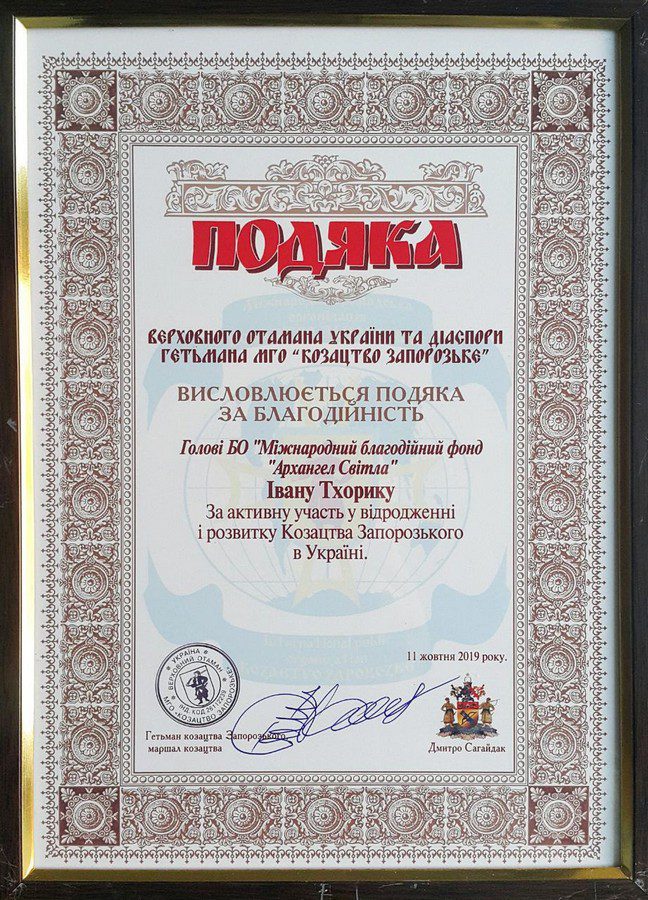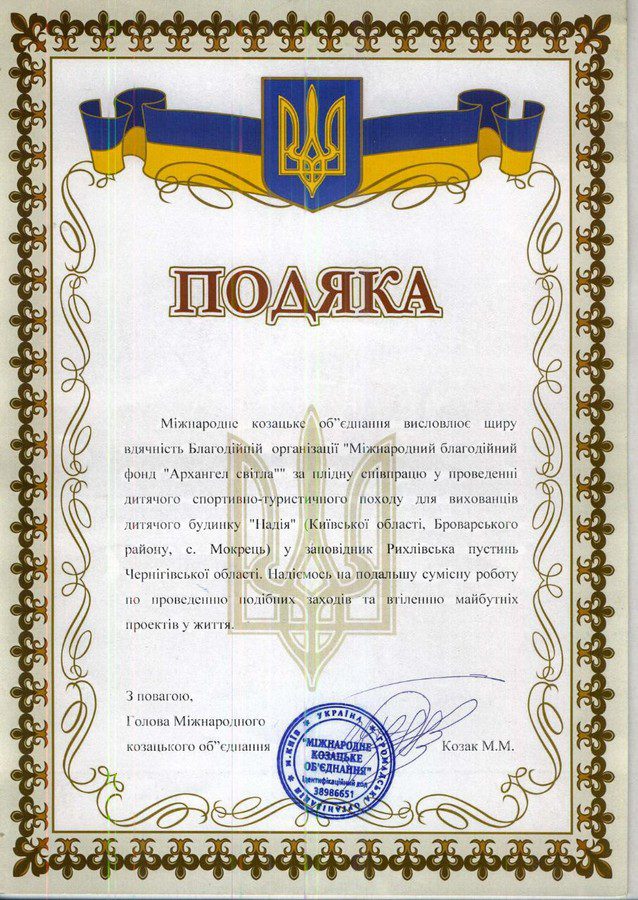Червень 2022 Подяка від директора благодійної організації «Благодійний фонд “Польова кухня”» Єрмака В.О. Травень 2022 Подяка від командира 8-ї окремої роти «ДГВ» ДФТГ «Легіон Д» Граба Олександра Травень 2022 Подяка від добровольчого формування територіальної громади Дніпровського району міста Києва Квітень 2022 Подяка від отамана Всеукраїнської громадської організації «Січ вільних козаків ВОВК» Квітень 2022 Подяка від Громадської організації «Народжені служити людям» … Подяка від голови Міжнародного козацького об’єднання Грудень 2021 Подяка від президента Федерації рукопашного бою Жовтень 2019 Подяка від верховного отамана України та діаспори гетьмана МГО «Козацтво Запорозьке» 2019 Диплом регіонального конкурсу «Благодійна Київщина – 2018» 2019 Свідоцтво учасника Національного рейтингу благодійників Березень 2018 Грамота від Звенигородської районної адміністрації Черкаської області 2018 Нагорода від Національного рейтингу благодійників 2017 Подяка від адміністрації школи №147 Деснянського району міста Києва Листопад 2017 Грамота від голови Громадської організації «ГАРАНТ» Жовтень 2015 Подяка від посольства України в Португалії Липень 2015 Подяка від колективу та дітей Макарівського районного центру соціальної підтримки дітей та сімей «Промінь надії» Травень 2015 Подяка від адміністрації та вихованців Київського обласного центру соціально-психологічної реабілітації дітей «Сезенків» Січень 2015 Подяка від президента Клубу успішних жінок міста Києва Січень 2015 Подяка від педагогічного та учнівського колективів комунального закладу «Володарська загальноосвітня санаторна школа-інтернат І-ІІІ ступенів» Січень 2015 Подяка від імені батьків та дітей з обмеженими можливостями Товариства «ДОМ» Грудень 2014 Подяка від адміністрації санітарної школи-інтернату №22 Оболонського району міста Києва. Листопад 2014 Подяка від церковної общини Свято-Георгіївської парафії с. Заворичі Броварського району Київської області Жовтень 2014 Подяка від адміністрації та вихованців дитячого будинку «Надія» Жовтень 2014 Подяка від адміністрації Київської міської дитячої клінічної лікарні №1 Жовтень 2014 Подяка від адміністрації Київської міської дитячої клінічної лікарні №2 Жовтень 2014 Подяка від адміністрації Київської загальноосвітньої школи-інтернату №4 Оболонського району міста Києва Жовтень 2014 Подяка від адміністрації Київського міського лівобережного центру для ВІЛ-інфікованих дітей та молоді Жовтень 2014 Подяка від адміністрації Дарницького дитячого будинку-інтернату Серпень 2014 Подяка від адміністрації та вихованців дитячого будинку «Надія» Червень 2014 Подяка від адміністрації та вихованців дитячого будинку «Надія» 2014 Подяка від директора Центру соціальних служб для сім’ї, дітей та молоді Дарницького району міста Києва 2014 Подяка від директора Центру соціальних служб для сім’ї, дітей та молоді Дарницького району міста Києва … Подяка від Української служби порятунку … Подяка від колективу дитячого центру «Моя родина» та його вихованців … Подяка від адміністрації та вихованців дитячого будинку «Надія» Благодіяння треба не розкидати, а розподіляти. Справа не в тому, що ти дав, а в тому, кому ти дав Сенека