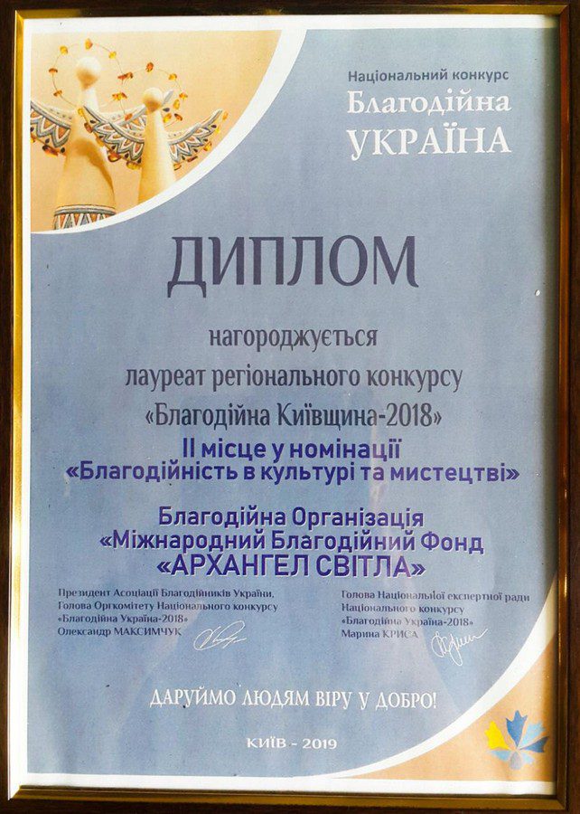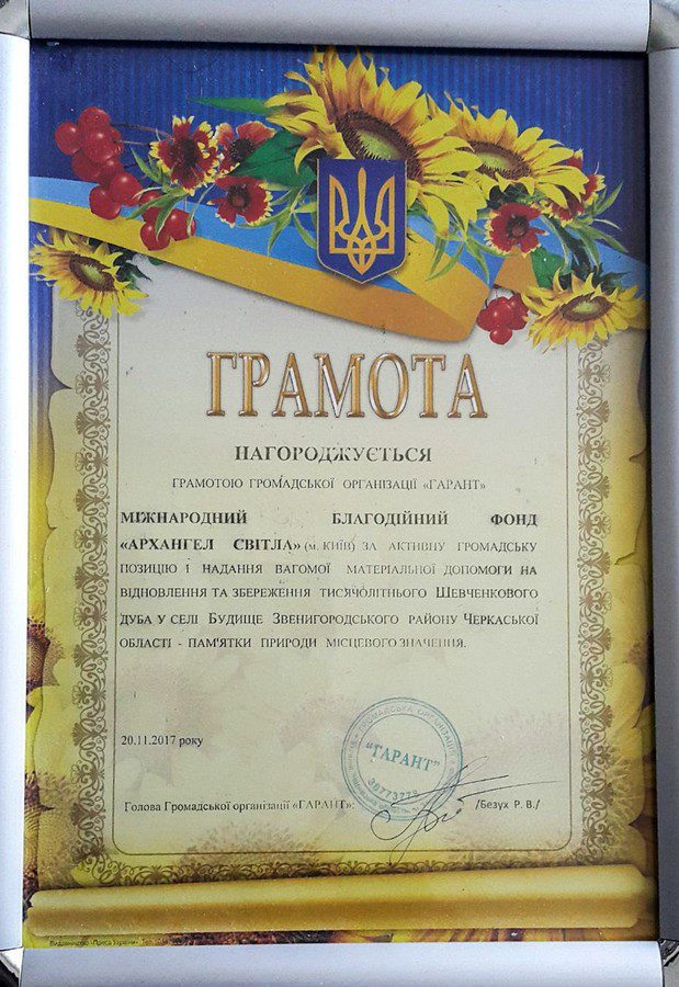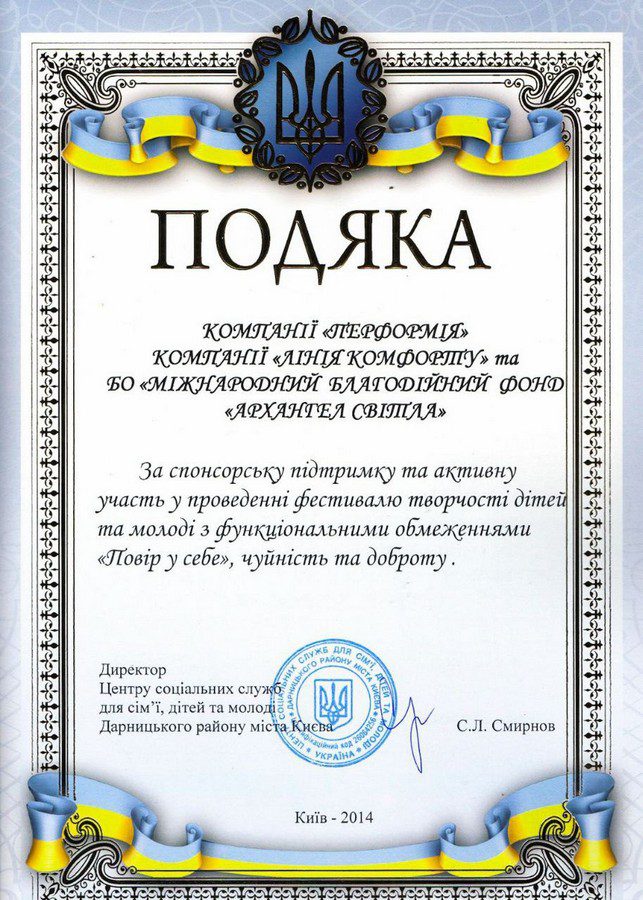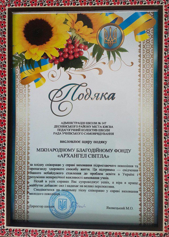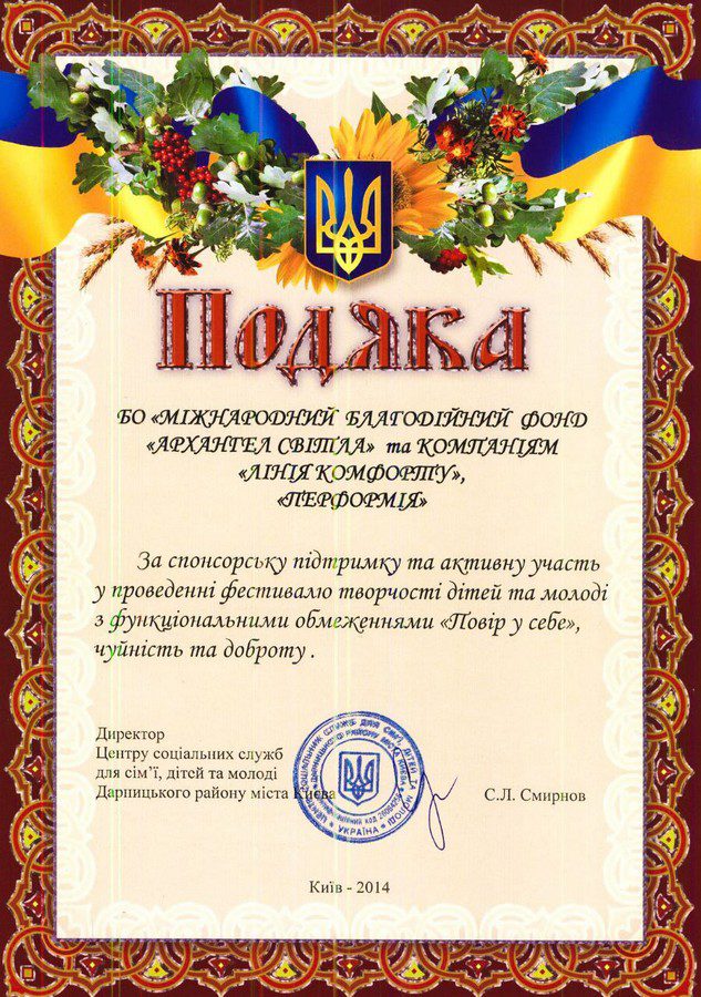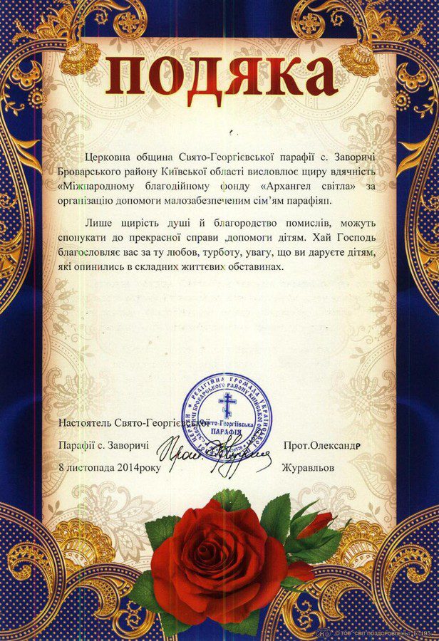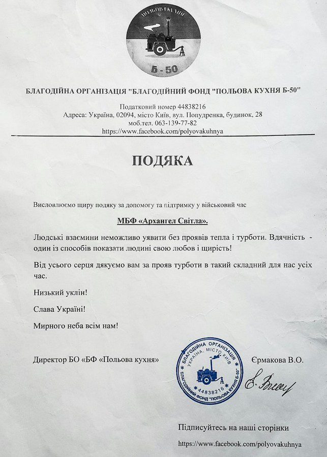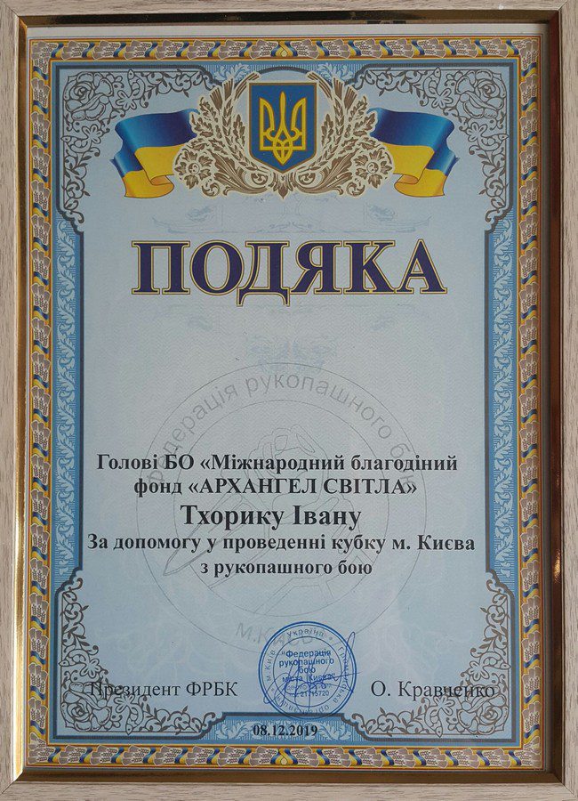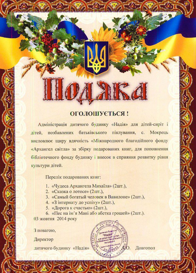 Червень 2022 Подяка від директора благодійної організації «Благодійний фонд “Польова кухня”» Єрмака В.О. Травень 2022 Подяка від командира 8-ї окремої роти «ДГВ» ДФТГ «Легіон Д» Граба Олександра Травень 2022 Подяка від добровольчого формування територіальної громади Дніпровського району міста Києва Квітень 2022 Подяка від отамана Всеукраїнської громадської організації «Січ вільних козаків ВОВК» Квітень 2022 Подяка від Громадської організації «Народжені служити людям» … Подяка від голови Міжнародного козацького об’єднання Грудень 2021 Подяка від президента Федерації рукопашного бою Жовтень 2019 Подяка від верховного отамана України та діаспори гетьмана МГО «Козацтво Запорозьке» 2019 Диплом регіонального конкурсу «Благодійна Київщина – 2018» 2019 Свідоцтво учасника Національного рейтингу благодійників Березень 2018 Грамота від Звенигородської районної адміністрації Черкаської області 2018 Нагорода від Національного рейтингу благодійників 2017 Подяка від адміністрації школи №147 Деснянського району міста Києва Листопад 2017 Грамота від голови Громадської організації «ГАРАНТ» Жовтень 2015 Подяка від посольства України в Португалії Липень 2015 Подяка від колективу та дітей Макарівського районного центру соціальної підтримки дітей та сімей «Промінь надії» Травень 2015 Подяка від адміністрації та вихованців Київського обласного центру соціально-психологічної реабілітації дітей «Сезенків» Січень 2015 Подяка від президента Клубу успішних жінок міста Києва Січень 2015 Подяка від педагогічного та учнівського колективів комунального закладу «Володарська загальноосвітня санаторна школа-інтернат І-ІІІ ступенів» Січень 2015 Подяка від імені батьків та дітей з обмеженими можливостями Товариства «ДОМ» Грудень 2014 Подяка від адміністрації санітарної школи-інтернату №22 Оболонського району міста Києва. Листопад 2014 Подяка від церковної общини Свято-Георгіївської парафії с. Заворичі Броварського району Київської області Жовтень 2014 Подяка від адміністрації та вихованців дитячого будинку «Надія» Жовтень 2014 Подяка від адміністрації Київської міської дитячої клінічної лікарні №1 Жовтень 2014 Подяка від адміністрації Київської міської дитячої клінічної лікарні №2 Жовтень 2014 Подяка від адміністрації Київської загальноосвітньої школи-інтернату №4 Оболонського району міста Києва Жовтень 2014 Подяка від адміністрації Київського міського лівобережного центру для ВІЛ-інфікованих дітей та молоді Жовтень 2014 Подяка від адміністрації Дарницького дитячого будинку-інтернату Серпень 2014 Подяка від адміністрації та вихованців дитячого будинку «Надія» Червень 2014 Подяка від адміністрації та вихованців дитячого будинку «Надія» 2014 Подяка від директора Центру соціальних служб для сім’ї, дітей та молоді Дарницького району міста Києва 2014 Подяка від директора Центру соціальних служб для сім’ї, дітей та молоді Дарницького району міста Києва … Подяка від Української служби порятунку … Подяка від колективу дитячого центру «Моя родина» та його вихованців … Подяка від адміністрації та вихованців дитячого будинку «Надія» Благодіяння треба не розкидати, а розподіляти. Справа не в тому, що ти дав, а в тому, кому ти дав Сенека