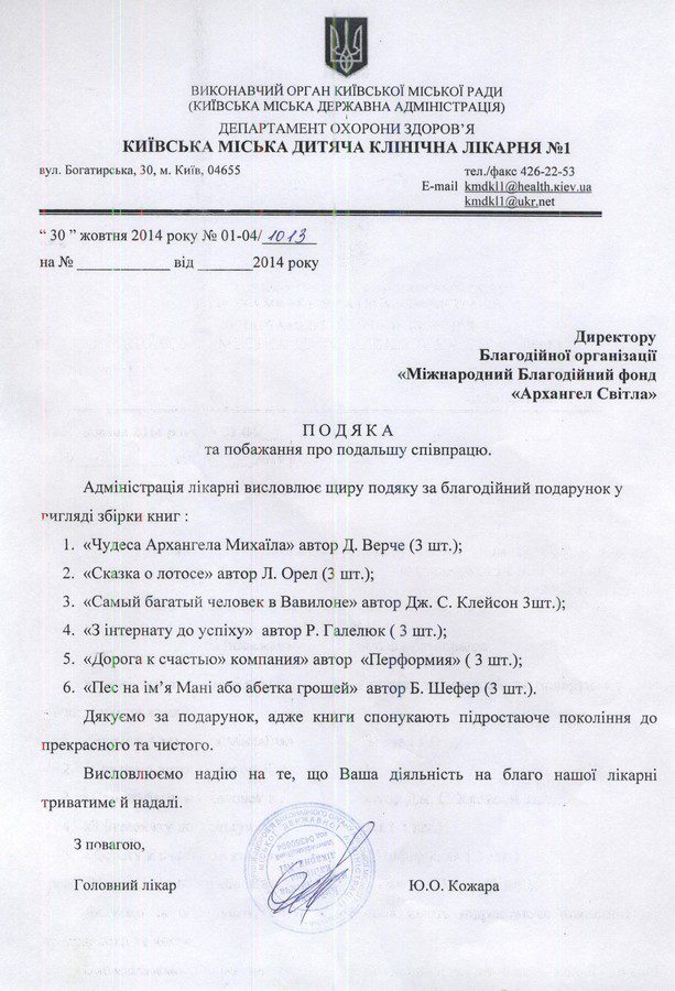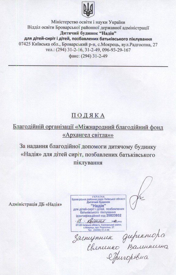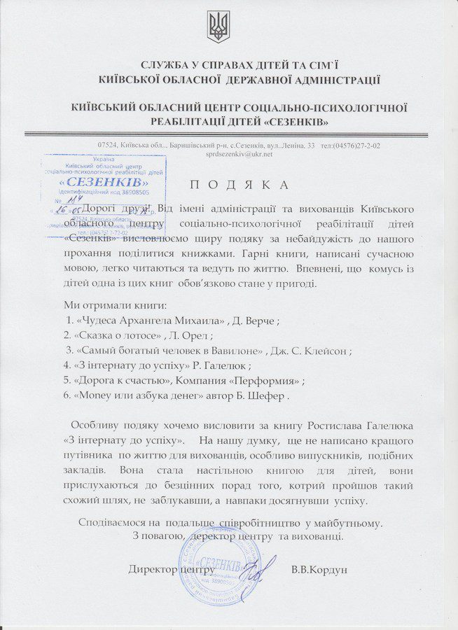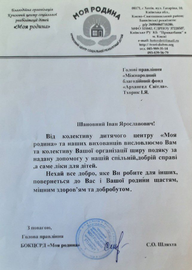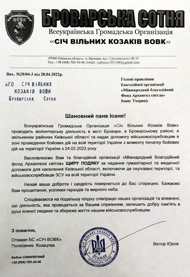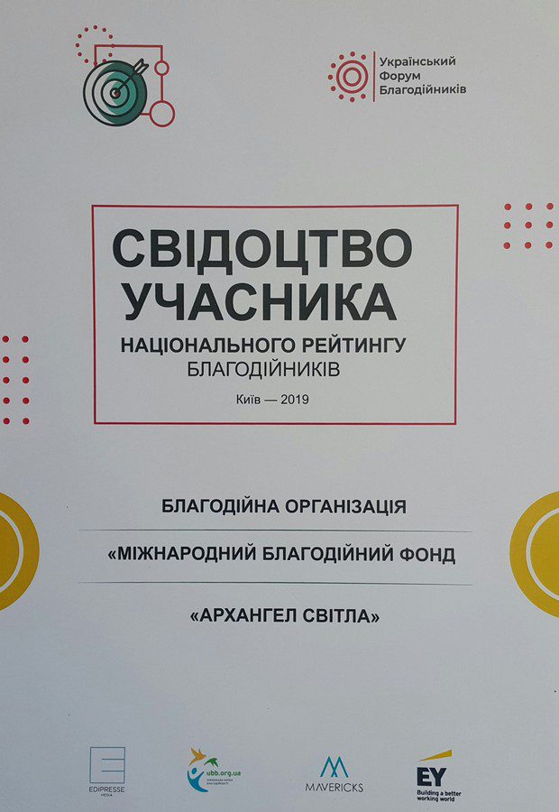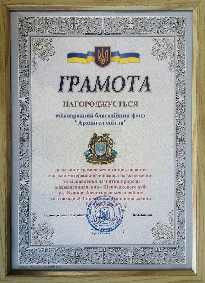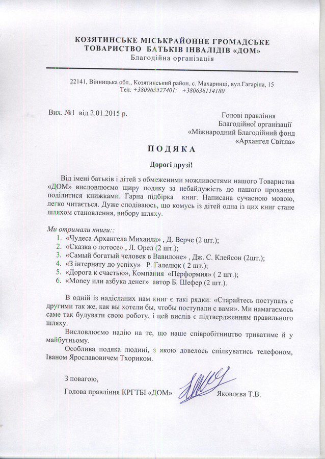 Червень 2022 Подяка від директора благодійної організації «Благодійний фонд “Польова кухня”» Єрмака В.О. Травень 2022 Подяка від командира 8-ї окремої роти «ДГВ» ДФТГ «Легіон Д» Граба Олександра Травень 2022 Подяка від добровольчого формування територіальної громади Дніпровського району міста Києва Квітень 2022 Подяка від отамана Всеукраїнської громадської організації «Січ вільних козаків ВОВК» Квітень 2022 Подяка від Громадської організації «Народжені служити людям» … Подяка від голови Міжнародного козацького об’єднання Грудень 2021 Подяка від президента Федерації рукопашного бою Жовтень 2019 Подяка від верховного отамана України та діаспори гетьмана МГО «Козацтво Запорозьке» 2019 Диплом регіонального конкурсу «Благодійна Київщина – 2018» 2019 Свідоцтво учасника Національного рейтингу благодійників Березень 2018 Грамота від Звенигородської районної адміністрації Черкаської області 2018 Нагорода від Національного рейтингу благодійників 2017 Подяка від адміністрації школи №147 Деснянського району міста Києва Листопад 2017 Грамота від голови Громадської організації «ГАРАНТ» Жовтень 2015 Подяка від посольства України в Португалії Липень 2015 Подяка від колективу та дітей Макарівського районного центру соціальної підтримки дітей та сімей «Промінь надії» Травень 2015 Подяка від адміністрації та вихованців Київського обласного центру соціально-психологічної реабілітації дітей «Сезенків» Січень 2015 Подяка від президента Клубу успішних жінок міста Києва Січень 2015 Подяка від педагогічного та учнівського колективів комунального закладу «Володарська загальноосвітня санаторна школа-інтернат І-ІІІ ступенів» Січень 2015 Подяка від імені батьків та дітей з обмеженими можливостями Товариства «ДОМ» Грудень 2014 Подяка від адміністрації санітарної школи-інтернату №22 Оболонського району міста Києва. Листопад 2014 Подяка від церковної общини Свято-Георгіївської парафії с. Заворичі Броварського району Київської області Жовтень 2014 Подяка від адміністрації та вихованців дитячого будинку «Надія» Жовтень 2014 Подяка від адміністрації Київської міської дитячої клінічної лікарні №1 Жовтень 2014 Подяка від адміністрації Київської міської дитячої клінічної лікарні №2 Жовтень 2014 Подяка від адміністрації Київської загальноосвітньої школи-інтернату №4 Оболонського району міста Києва Жовтень 2014 Подяка від адміністрації Київського міського лівобережного центру для ВІЛ-інфікованих дітей та молоді Жовтень 2014 Подяка від адміністрації Дарницького дитячого будинку-інтернату Серпень 2014 Подяка від адміністрації та вихованців дитячого будинку «Надія» Червень 2014 Подяка від адміністрації та вихованців дитячого будинку «Надія» 2014 Подяка від директора Центру соціальних служб для сім’ї, дітей та молоді Дарницького району міста Києва 2014 Подяка від директора Центру соціальних служб для сім’ї, дітей та молоді Дарницького району міста Києва … Подяка від Української служби порятунку … Подяка від колективу дитячого центру «Моя родина» та його вихованців … Подяка від адміністрації та вихованців дитячого будинку «Надія» Благодіяння треба не розкидати, а розподіляти. Справа не в тому, що ти дав, а в тому, кому ти дав Сенека