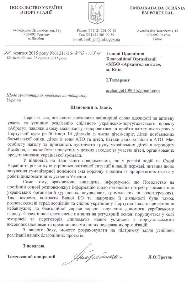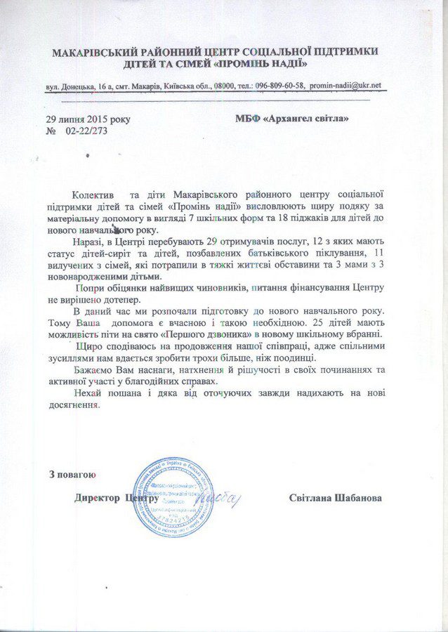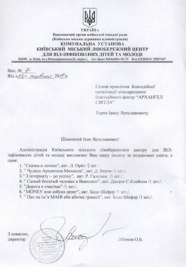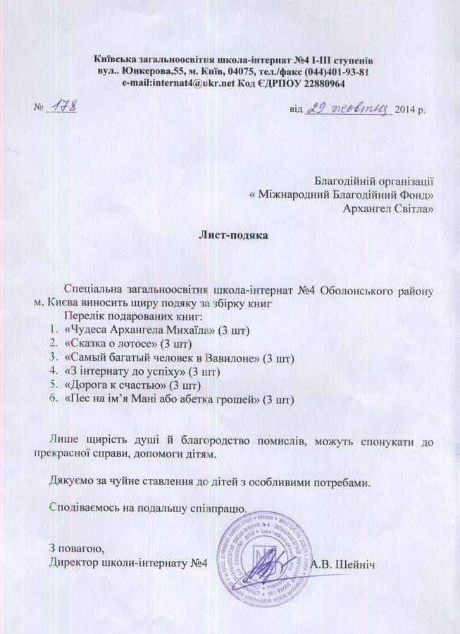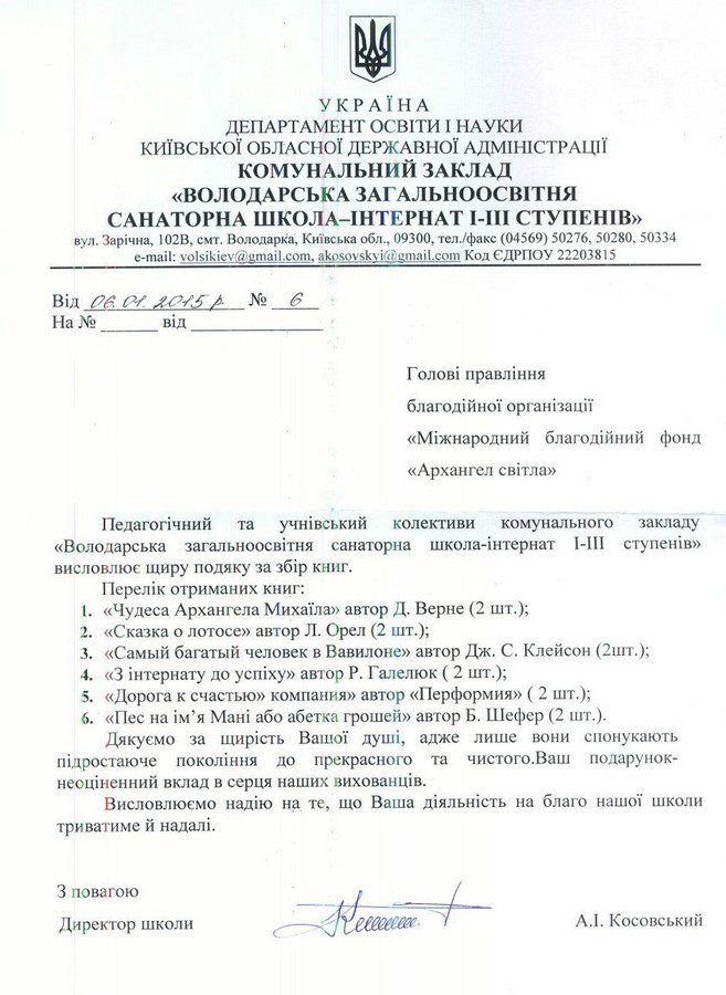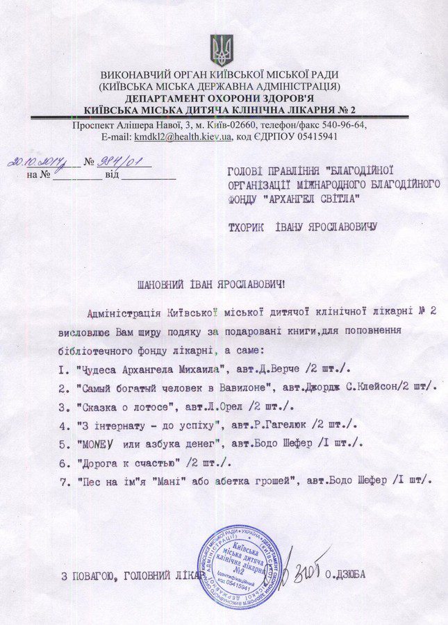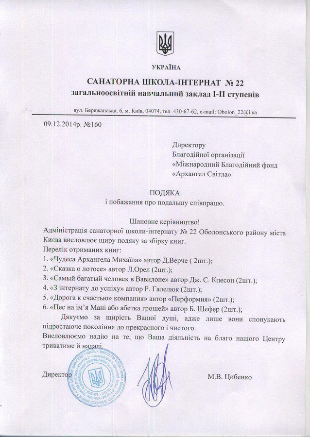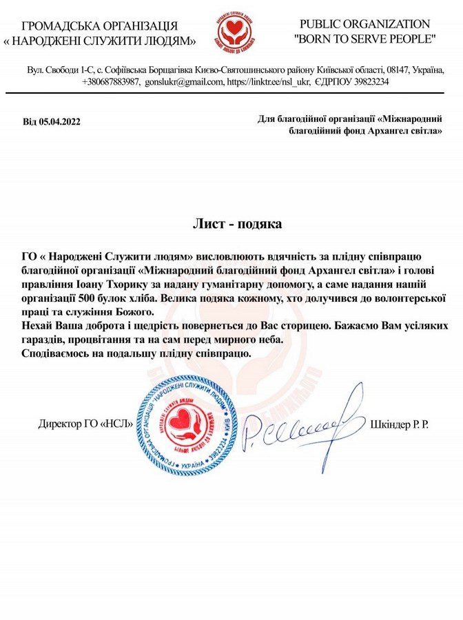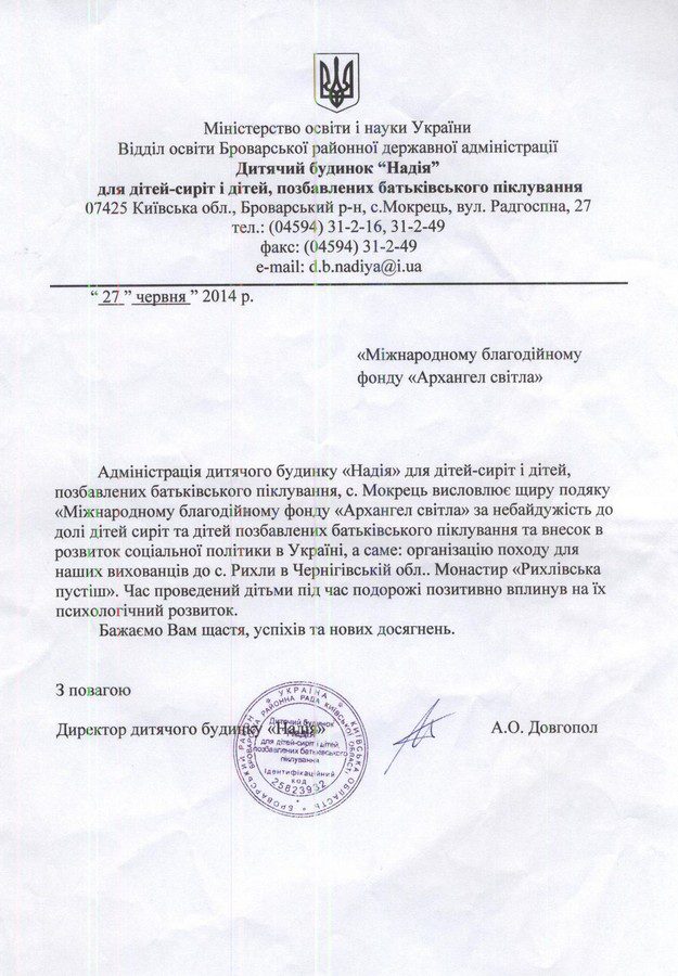 Червень 2022 Подяка від директора благодійної організації «Благодійний фонд “Польова кухня”» Єрмака В.О. Травень 2022 Подяка від командира 8-ї окремої роти «ДГВ» ДФТГ «Легіон Д» Граба Олександра Травень 2022 Подяка від добровольчого формування територіальної громади Дніпровського району міста Києва Квітень 2022 Подяка від отамана Всеукраїнської громадської організації «Січ вільних козаків ВОВК» Квітень 2022 Подяка від Громадської організації «Народжені служити людям» … Подяка від голови Міжнародного козацького об’єднання Грудень 2021 Подяка від президента Федерації рукопашного бою Жовтень 2019 Подяка від верховного отамана України та діаспори гетьмана МГО «Козацтво Запорозьке» 2019 Диплом регіонального конкурсу «Благодійна Київщина – 2018» 2019 Свідоцтво учасника Національного рейтингу благодійників Березень 2018 Грамота від Звенигородської районної адміністрації Черкаської області 2018 Нагорода від Національного рейтингу благодійників 2017 Подяка від адміністрації школи №147 Деснянського району міста Києва Листопад 2017 Грамота від голови Громадської організації «ГАРАНТ» Жовтень 2015 Подяка від посольства України в Португалії Липень 2015 Подяка від колективу та дітей Макарівського районного центру соціальної підтримки дітей та сімей «Промінь надії» Травень 2015 Подяка від адміністрації та вихованців Київського обласного центру соціально-психологічної реабілітації дітей «Сезенків» Січень 2015 Подяка від президента Клубу успішних жінок міста Києва Січень 2015 Подяка від педагогічного та учнівського колективів комунального закладу «Володарська загальноосвітня санаторна школа-інтернат І-ІІІ ступенів» Січень 2015 Подяка від імені батьків та дітей з обмеженими можливостями Товариства «ДОМ» Грудень 2014 Подяка від адміністрації санітарної школи-інтернату №22 Оболонського району міста Києва. Листопад 2014 Подяка від церковної общини Свято-Георгіївської парафії с. Заворичі Броварського району Київської області Жовтень 2014 Подяка від адміністрації та вихованців дитячого будинку «Надія» Жовтень 2014 Подяка від адміністрації Київської міської дитячої клінічної лікарні №1 Жовтень 2014 Подяка від адміністрації Київської міської дитячої клінічної лікарні №2 Жовтень 2014 Подяка від адміністрації Київської загальноосвітньої школи-інтернату №4 Оболонського району міста Києва Жовтень 2014 Подяка від адміністрації Київського міського лівобережного центру для ВІЛ-інфікованих дітей та молоді Жовтень 2014 Подяка від адміністрації Дарницького дитячого будинку-інтернату Серпень 2014 Подяка від адміністрації та вихованців дитячого будинку «Надія» Червень 2014 Подяка від адміністрації та вихованців дитячого будинку «Надія» 2014 Подяка від директора Центру соціальних служб для сім’ї, дітей та молоді Дарницького району міста Києва 2014 Подяка від директора Центру соціальних служб для сім’ї, дітей та молоді Дарницького району міста Києва … Подяка від Української служби порятунку … Подяка від колективу дитячого центру «Моя родина» та його вихованців … Подяка від адміністрації та вихованців дитячого будинку «Надія» Благодіяння треба не розкидати, а розподіляти. Справа не в тому, що ти дав, а в тому, кому ти дав Сенека