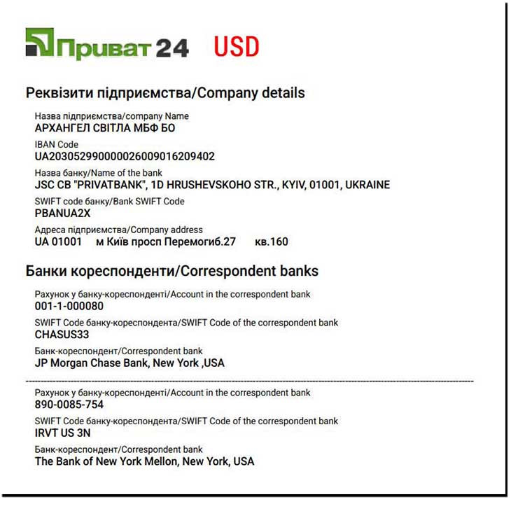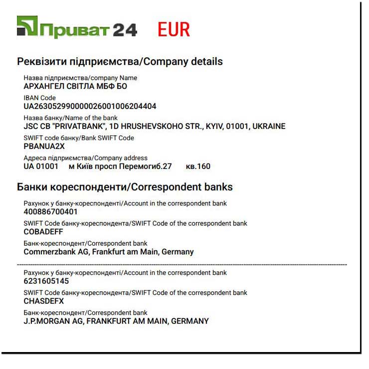 Реквізити ПриватБанк – USD; EUR; ГРН