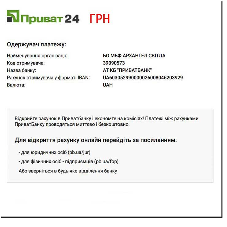Одержувач платежу: АРХАНГЕЛ СВIТЛА МБФ БО